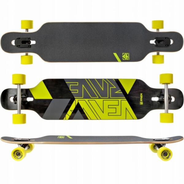 [The Raven Torex longboard has been designed for taking tight turns or maneuvering between cones. Raven Torex Skating Technique does not differ much from the pumping style, thanks to which the rider is able to easily maintain the speed by performing maneuvers. The short table top is characterized by a small turning radius and facilitates pumping. Soft trucks that move in two levels and a hard deck allow you to recreate the feeling of surfing. Thanks to the sharp edges of the wheels, the Raven Torex provides maximum grip during sharp turns. (image) Board specification: